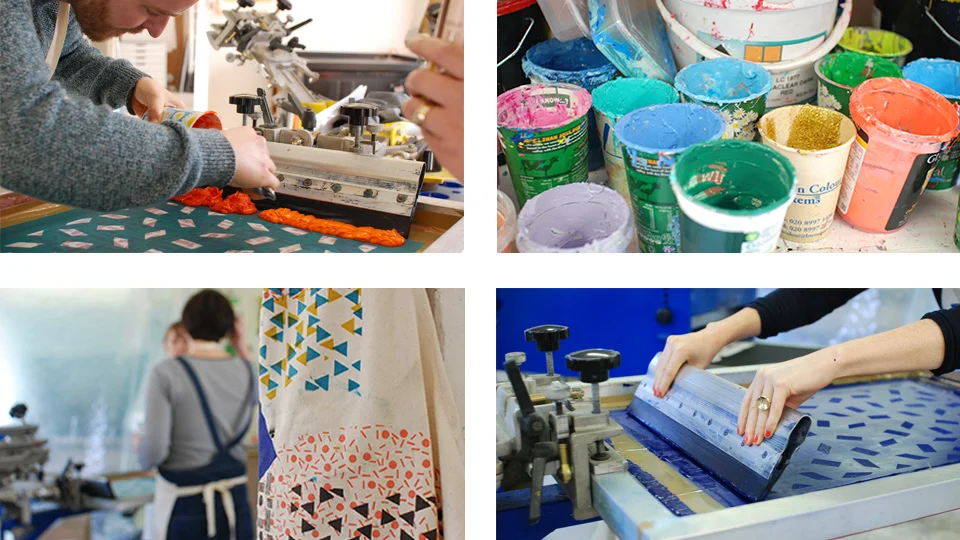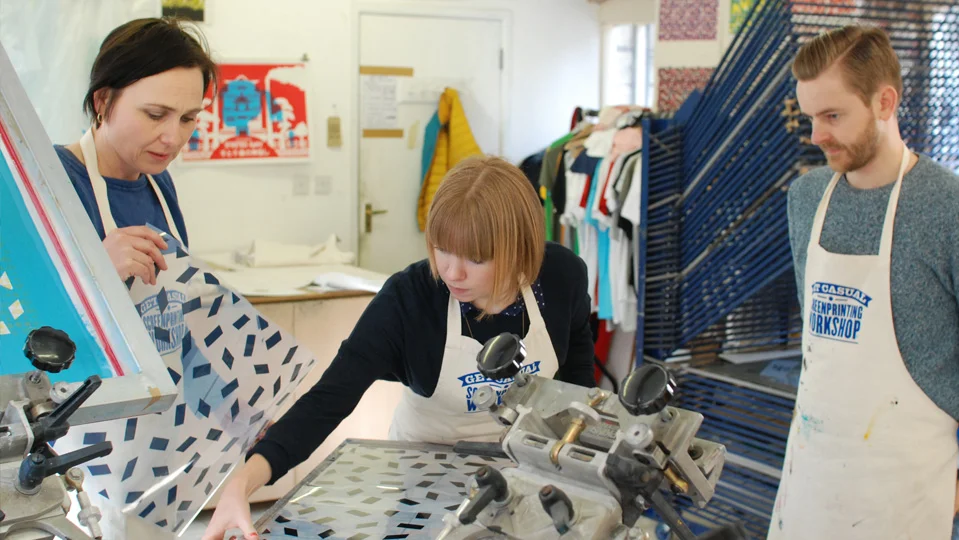 After taking them through the print process we set about creating a collaborative print featuring all three artists work over printed onto tea towels. If you would like to book one of our day courses then head over to our workshops page